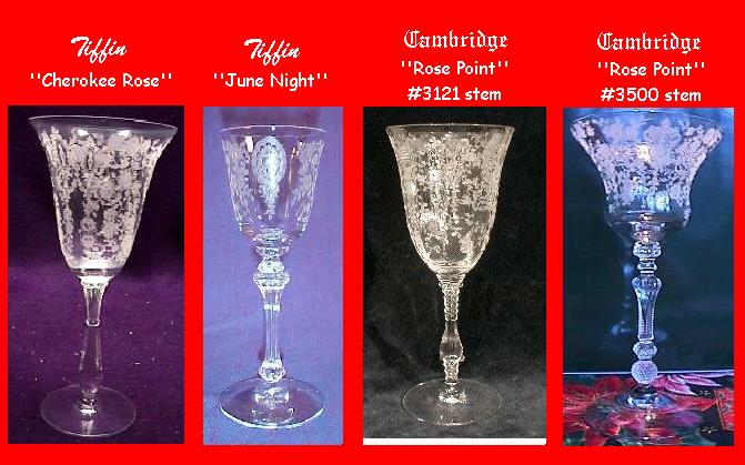 Click on the picture of the three stems (at left) to see the stemware for the three patterns compared side-by-side. Note that only two of the numerous stems that were done in Rose Point are shown - stem #3121 which is the most popular shape, and #3500 which comes in second. Both the June Night and Cherokee Rose patterns come on several different Tiffin stems besides the ones pictured.