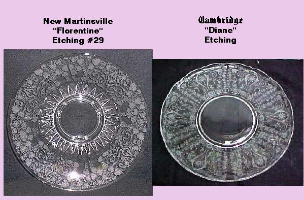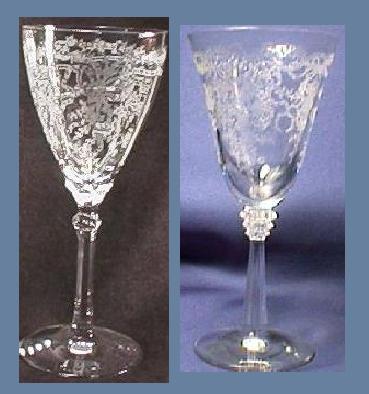 Rose Point (left), by Cambridge Glass Company of Cambridge, OH, is